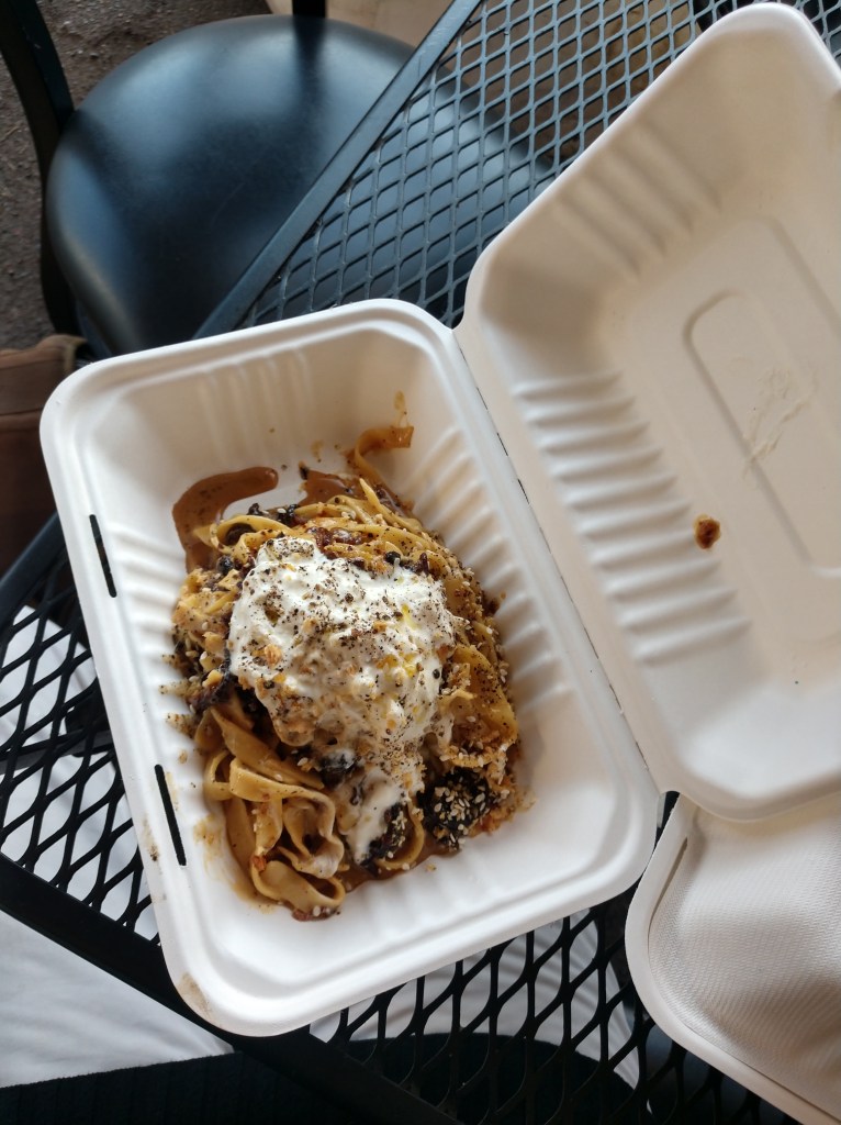Pasta with chili, sweet carmalized onion, and fresh cream and mozzerella, wow! Just a little bit of sweetness to an otherwise savory dish.