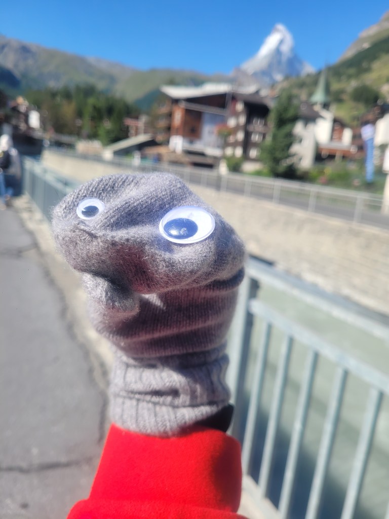 Bonus Note: Okay, I got these mittens in Scotland, and about four seconds into wearing one of them realized it looked like a hand puppet. I had some spare googly eyes in my pocket and shortly thereafter adhered them to the mitten and decided that I wanted a photo of this thing in front of every major sightseeing sight (and then promptly forgot), but I did manage to get this shot in front of the Matterhorn.