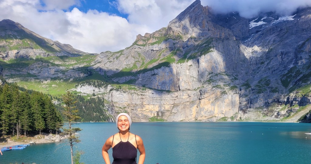 Okay, so now the fun bit. The Alpine slide. There are slides in Switzerland that require a gondola to get to the top, and once you’re up there, take you on a winding ride in a kart the half way down the side of the mountain. There are two kinds of alpine slides; summer and winter alpine slides. The summer slides are either basically go-karts in a track with a handbrake on a metal slide/track (gravity-powered, not motorized), or mountain rollercoaster style. Then in the winter, there are *actual* toboggans in snow tracks, like luge. The one I did was more like a go-kart on a metal track. Although it’s gravity powered on the way down, there is a motorized pulley system to take you up, much like when you’re climbing to the top on a rollercoaster. The track then winds all the way down the side of mountain back to where you started. The slide I went to is called the Rodelbahn, and it’s a couple of minutes long. If you want to enjoy your ride or go fast, (or at the very least not get stuck in a traffic jam behind someone’s grandmother) You’ve definitely got to strategically position yourself in line behind people who look like they’re going to go fast. There are a lot of parents with their babies or toddlers in their laps that want to go down the slide, grandparents, and many people that have never done this and are scared of going too fast going down the slide, and the result is that they ride the handbrake the entire way down and cause a very large traffic jam, since nobody can go faster than them. Pay attention to who you’re standing behind in line if you’d like to avoid this. There are large signs at the top that say not to brake and stop at the top, but I found it helpful to wait at the top a few extra seconds for the traffic below to clear, while paying careful attention to when the person behind me was coming, so they didn’t get stuck behind me. This gave me an opportunity to create more space between myself and the person ahead of me, so that I could ride with the handbrake all the way off the entire way down. It took around two or three times for me to figure out how to get a brake-free ride down, but I eventually did on the last ride. I’ll say the individual rides are relatively cheap, but the gondola ride up is about $30 round-trip per person (Unless you get a Swiss travel pass, which I did not spend the money on ahead of time). Once you’re up, though, you can buy individual rides for $6 each, or you can buy a few at a time and save a few bucks per-ride. It’s definitely worth going at least a few times. Plus there’s a SPECTACULAR hike up there once you’re done with the slide. It takes about twenty five minutes to get down to the scenic view point, but there’s a panorama view with lightly snow-capped mountains in the back (if you go in the summer), and a gorgeous lake that’s perfect for a picnic, or a drink (See photos below).